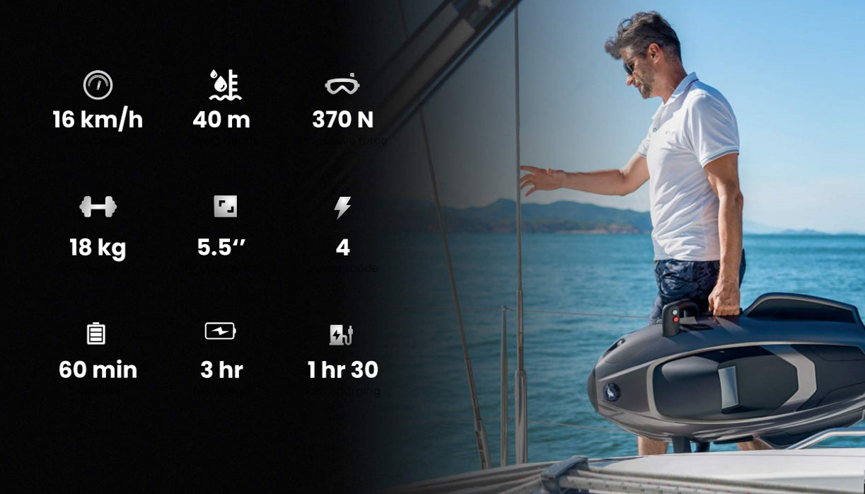 Despite its light weight, the ALTIVS APX delivers exceptional performance with a maximum speed of 16 km/h, matching top-tier scooters. Its 1-hour battery life supports extensive range and deep dives up to 40m. The ultra-efficient stealth ducted impeller minimizes energy loss and noise, and high-quality materials ensure durability for years.