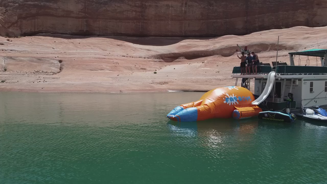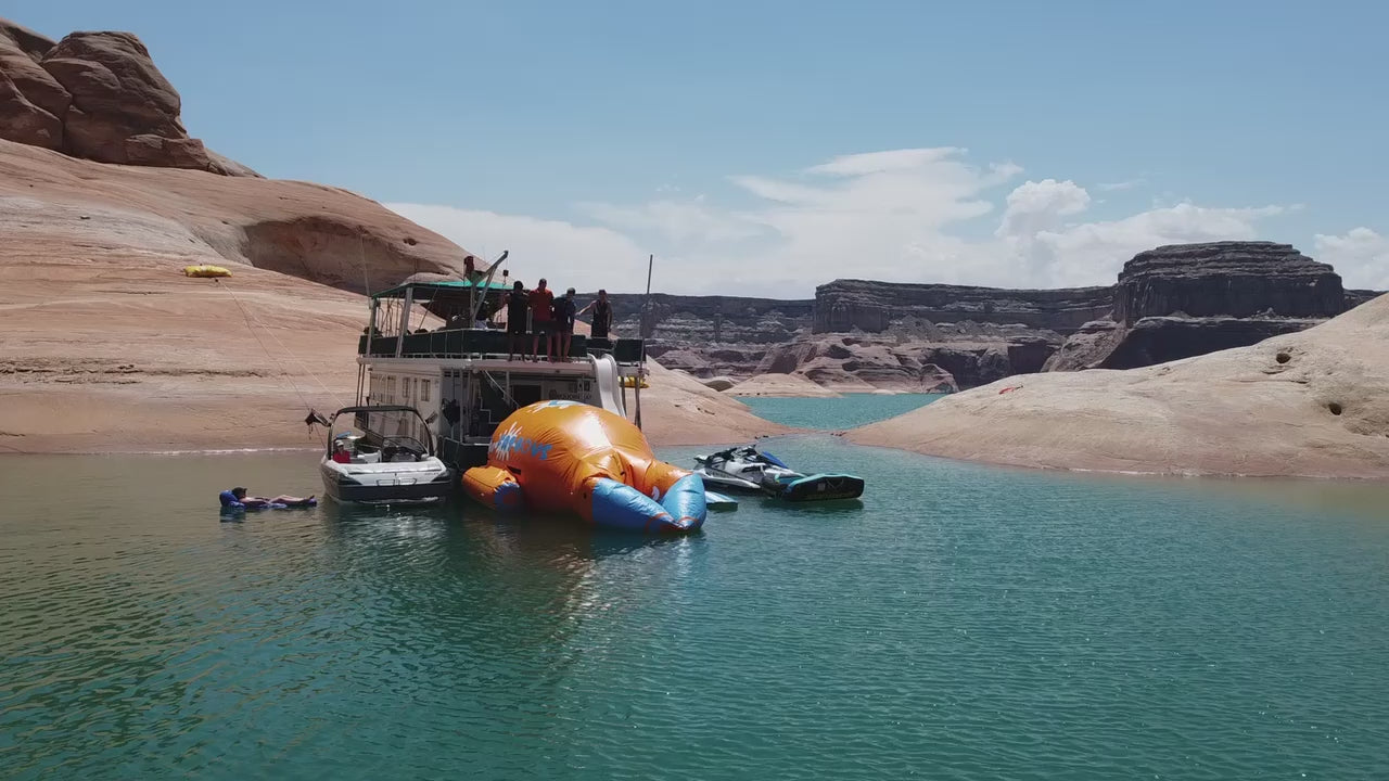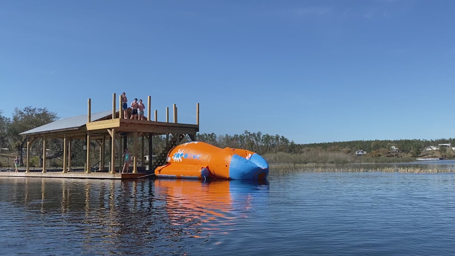 Inflates in 40-45 minutes with minimal equipment (shop vac or leaf blower required, not included), supported by stabilizing side buoys.